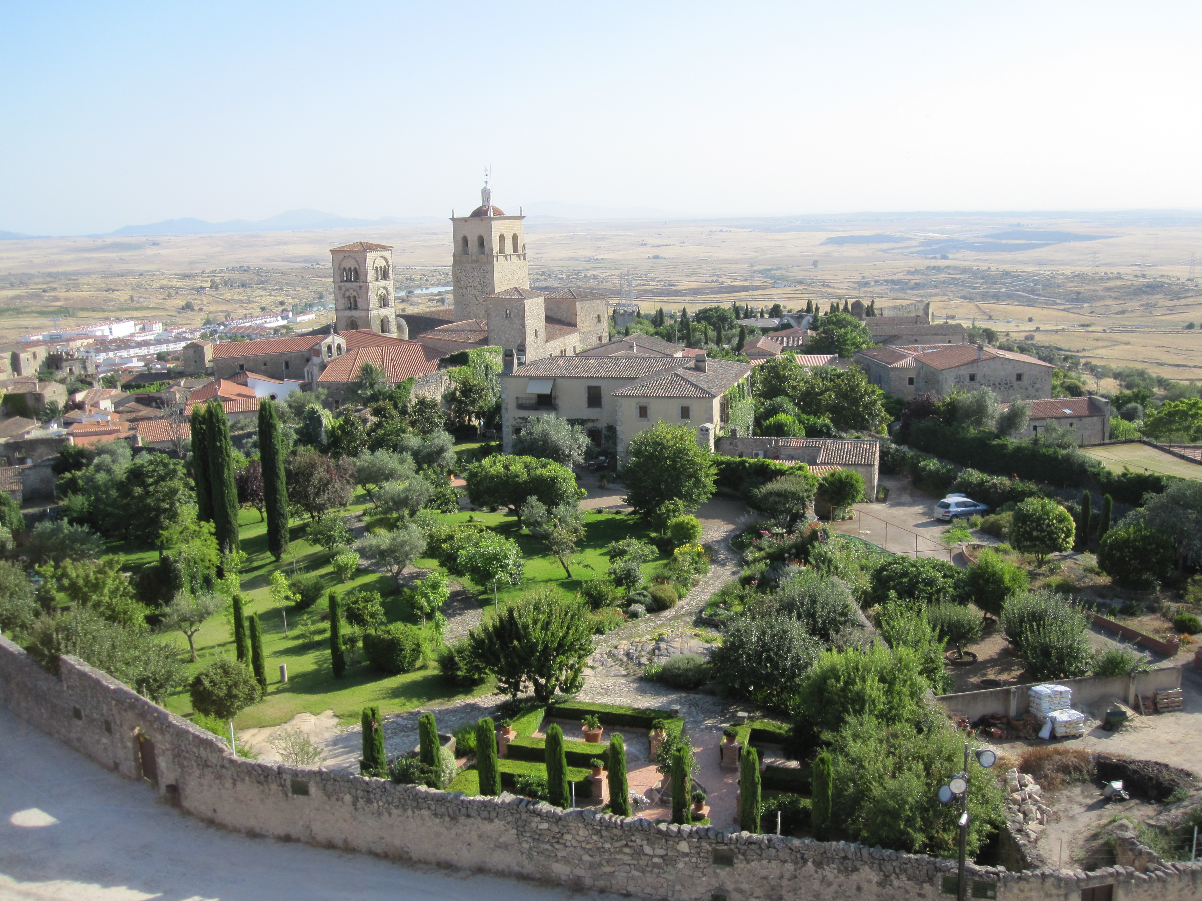Below is the view of the Church Santa Maria la Mayor and the green gardens of one of the mansions owned by an American who decided to retire in Trujillo, and why not, Live like a KING!