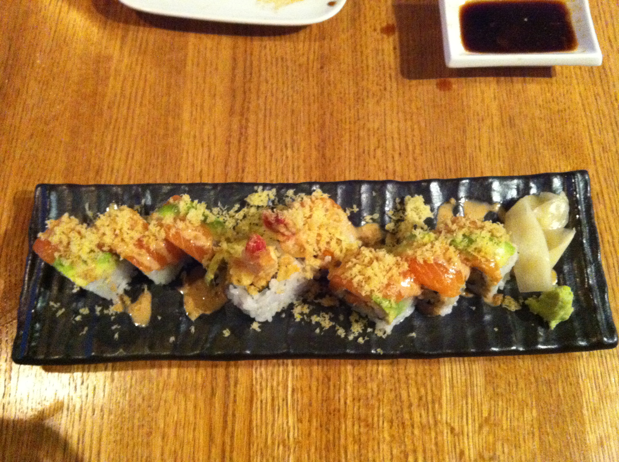 Delicious as well, had shrimp tempura and Salmon and avocado on the outside, with a sesame sauce and tempura crumble on the top.