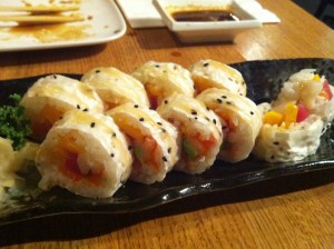 Salmon with pieces of Mango, blood red orange, avocado, wrapped in soy wrap. It was sweet and yummy it felt like dessert to me.  The only thing that I would add to it is a slice of thinly sliced serrano pepper and a dot of Sriracha. That in my opinion would make this roll even better.