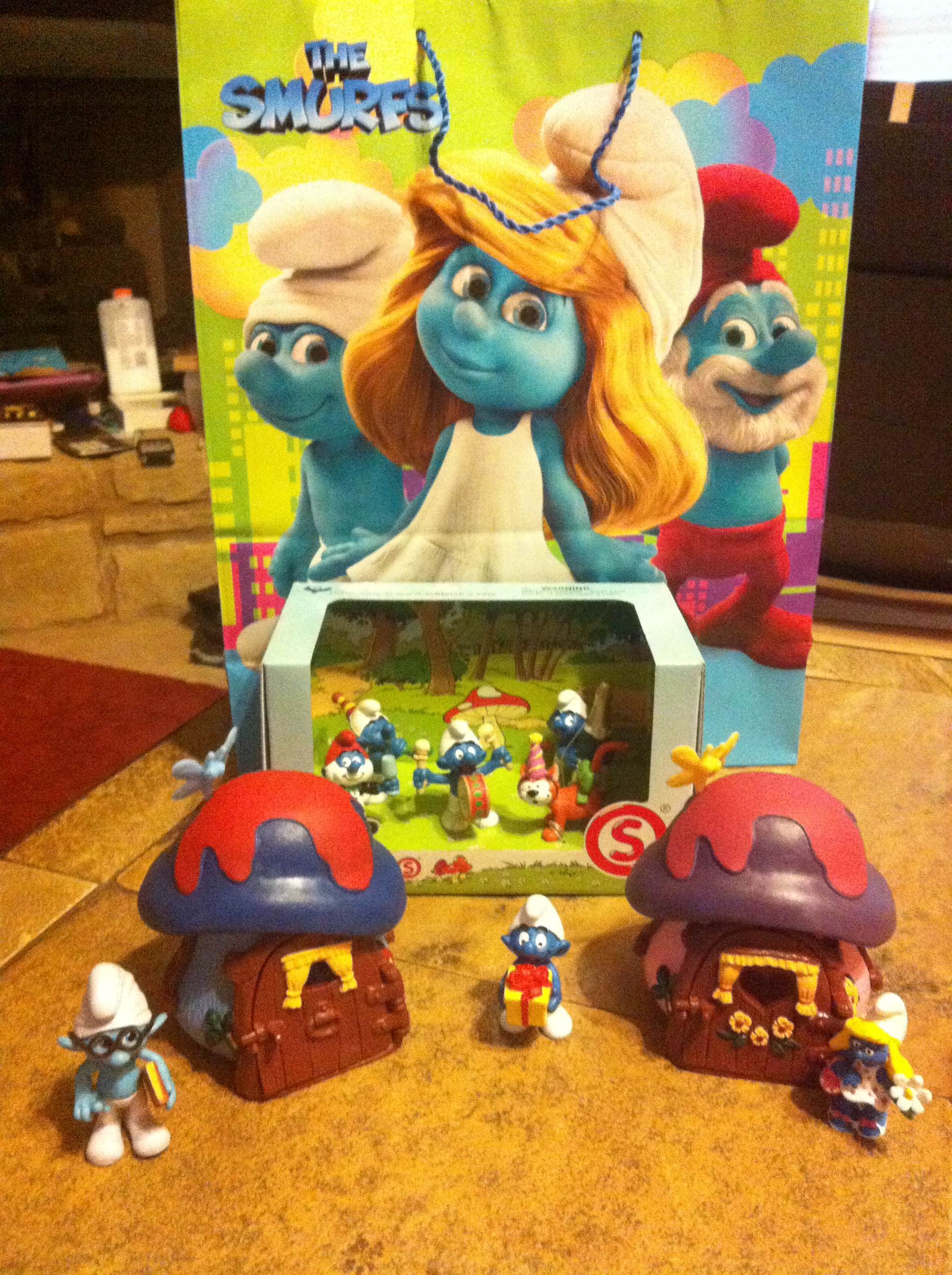 It was NOT easy to find any smurf items in the stores, but Amazon is always there to save the day! we bought a couple mushroom houses and some character sets (from the 80s of course!) and that was what I was going to use to decorate the cake at the birthday party.