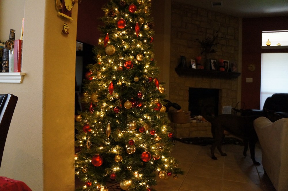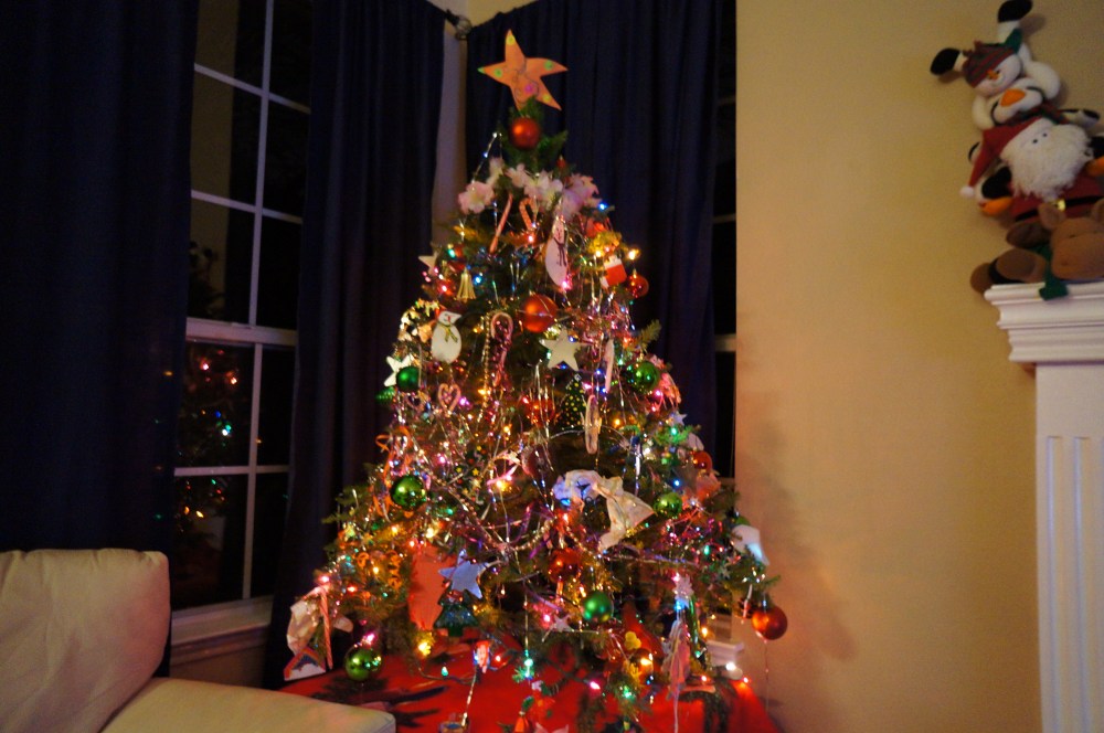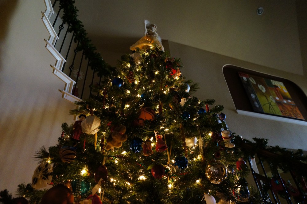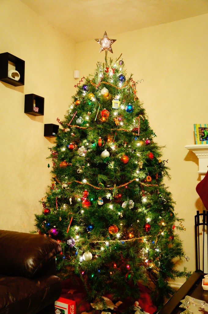 In comparison to the trees above, the Rubio’s family tree is real pine. It’s very bold with the colored lights and different color balls. My favorite thing about their tree is that they always hang candy canes from it, yummy starburst ones that on occasion I’ve been lucky to get one!