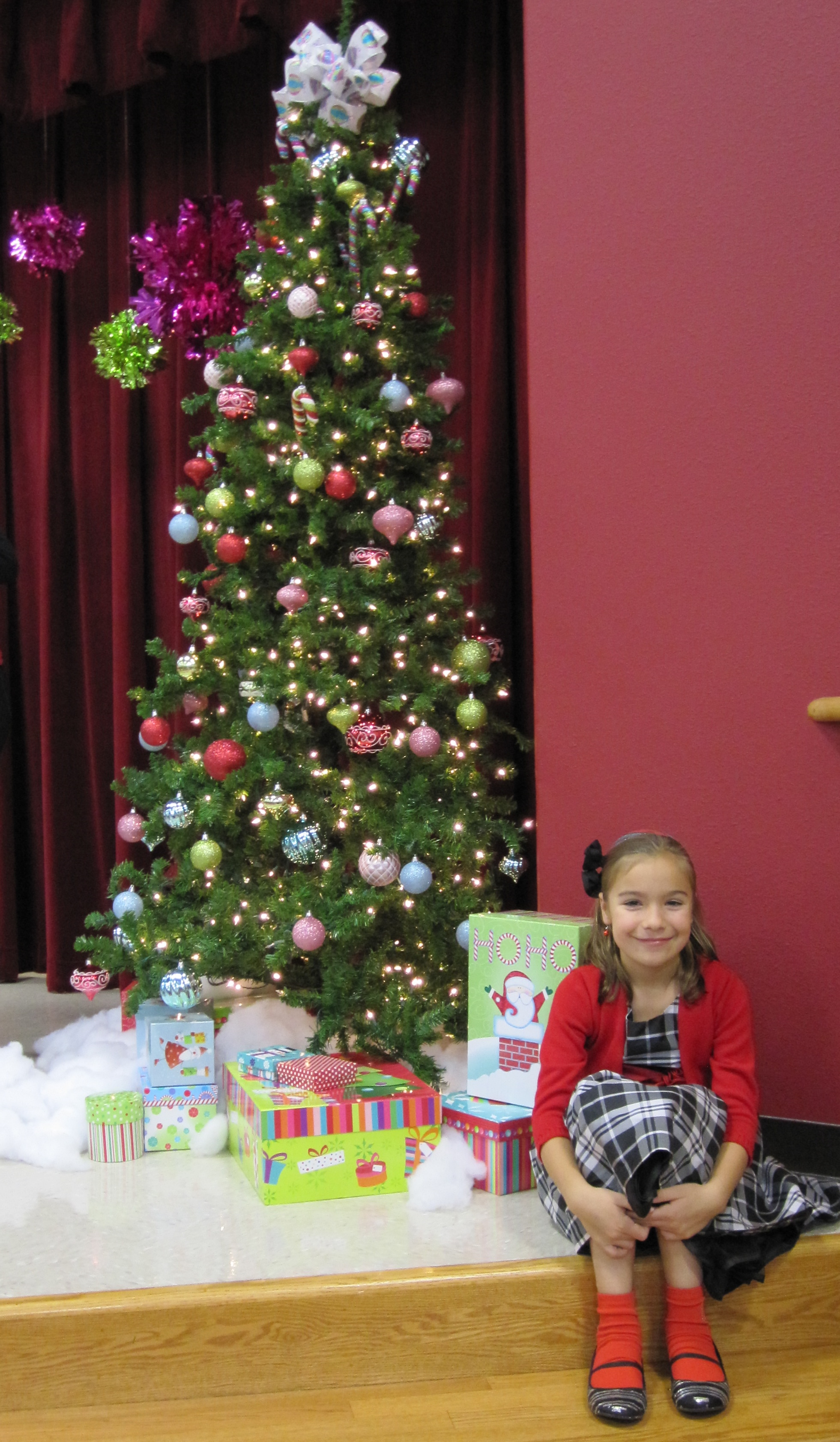 The 2nd Saturday of December, the school always has Pancake breakfast with Santa, and the choir sings and you take lots of pics, etc. They have a few trees that they put up every year, I in particular like this one with all the shiny ornaments. It’s not traditional Christmasy colors, but I like it because it’s shimmery and kid type colors which makes the school auditorium/cafeteria look bright and at the same time warm and cozy. It’s too bad that the decor is only up for this Saturday and not up for the whole 2 weeks that school is in session in December.
