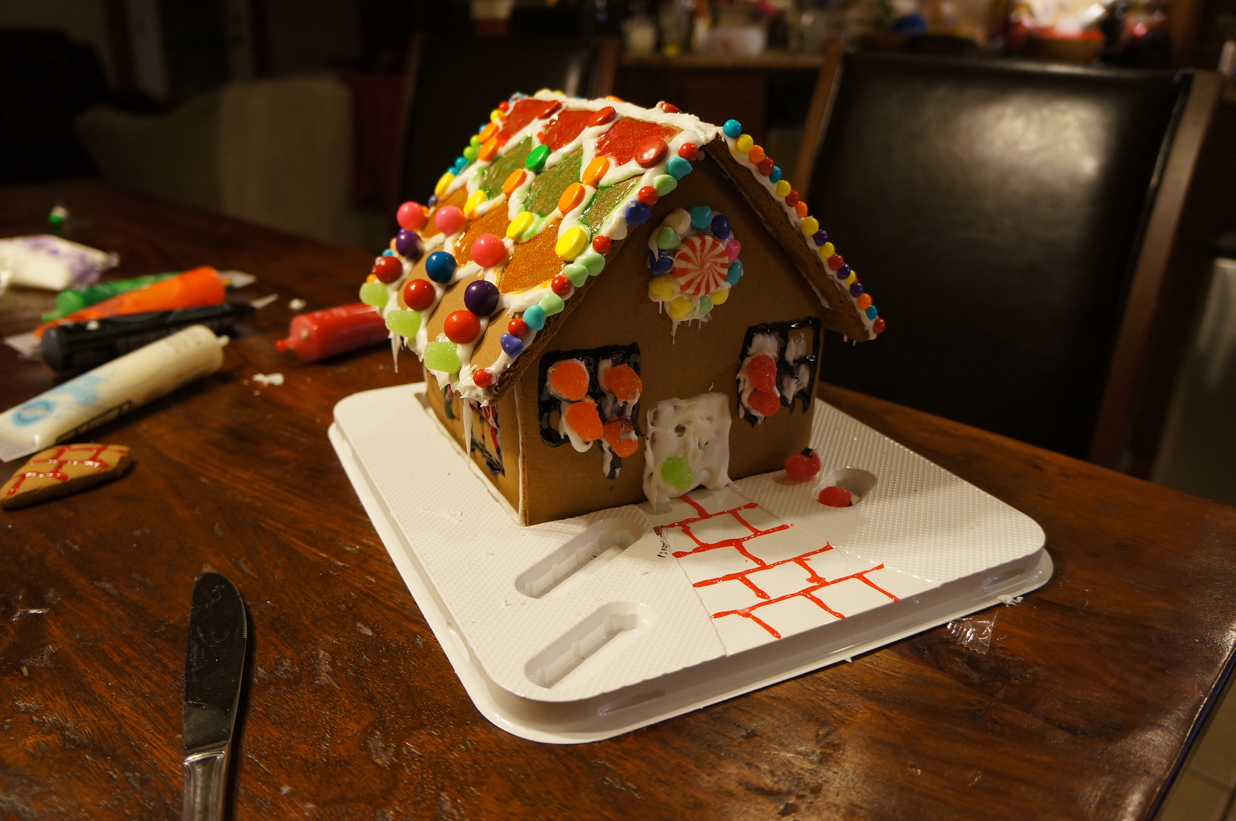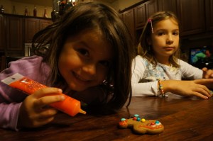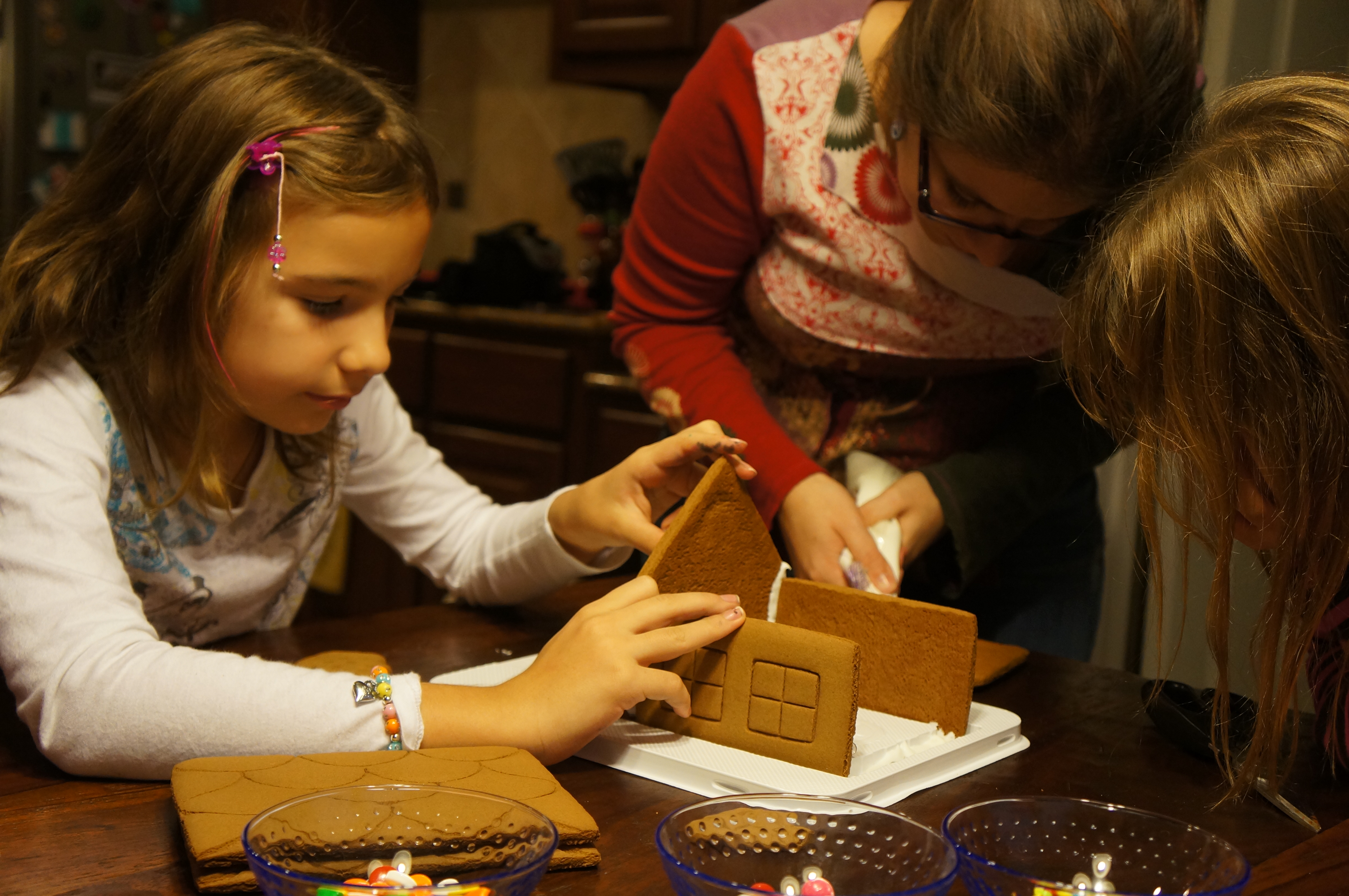Then usually putting our gingerbread house together comes next, this year we had some help our friend’s daughters, so all three girls helped in the process of decorating and eating an occasional candy here and there too, they are quite sneaky! The rest can be told in pictures…