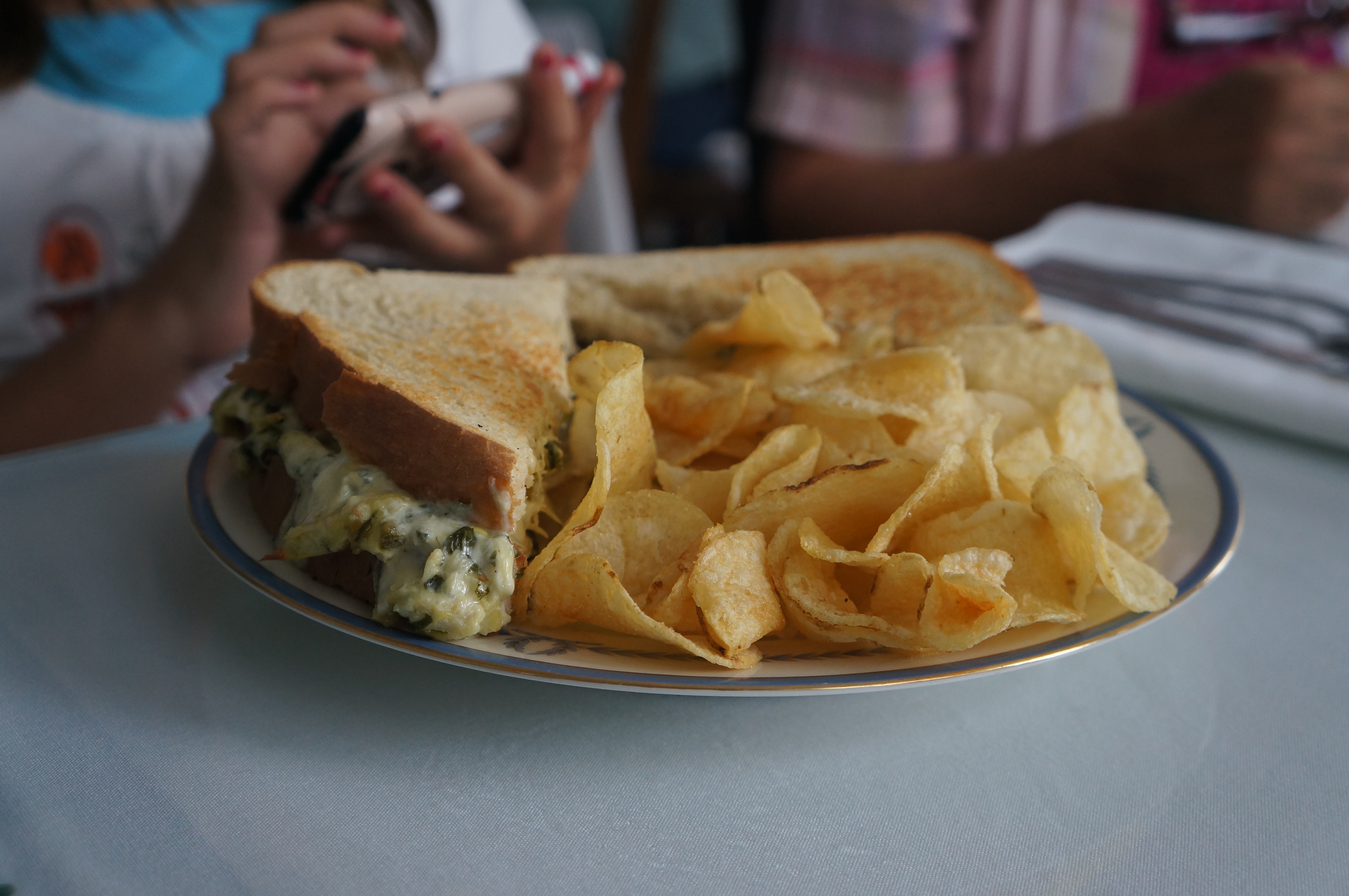 We all ordered different things off the menu, but I think the best choice was Carolina’s grilled cheese sandwich. Not your ordinary one of course! This one was made with Artichoke, spinach and cheese (I think Gruyere) and bacon, served with Kettle Chips.
