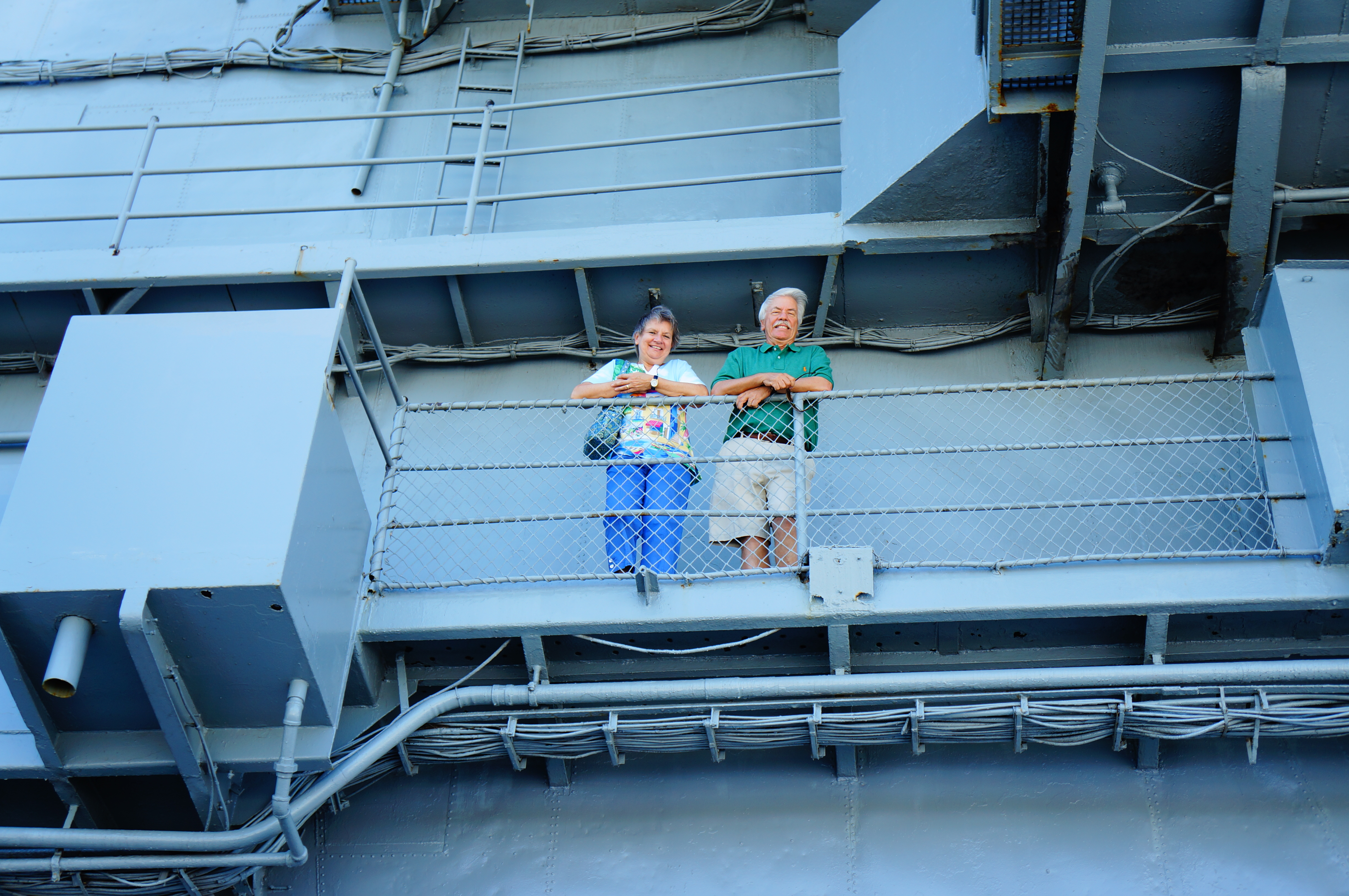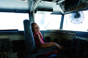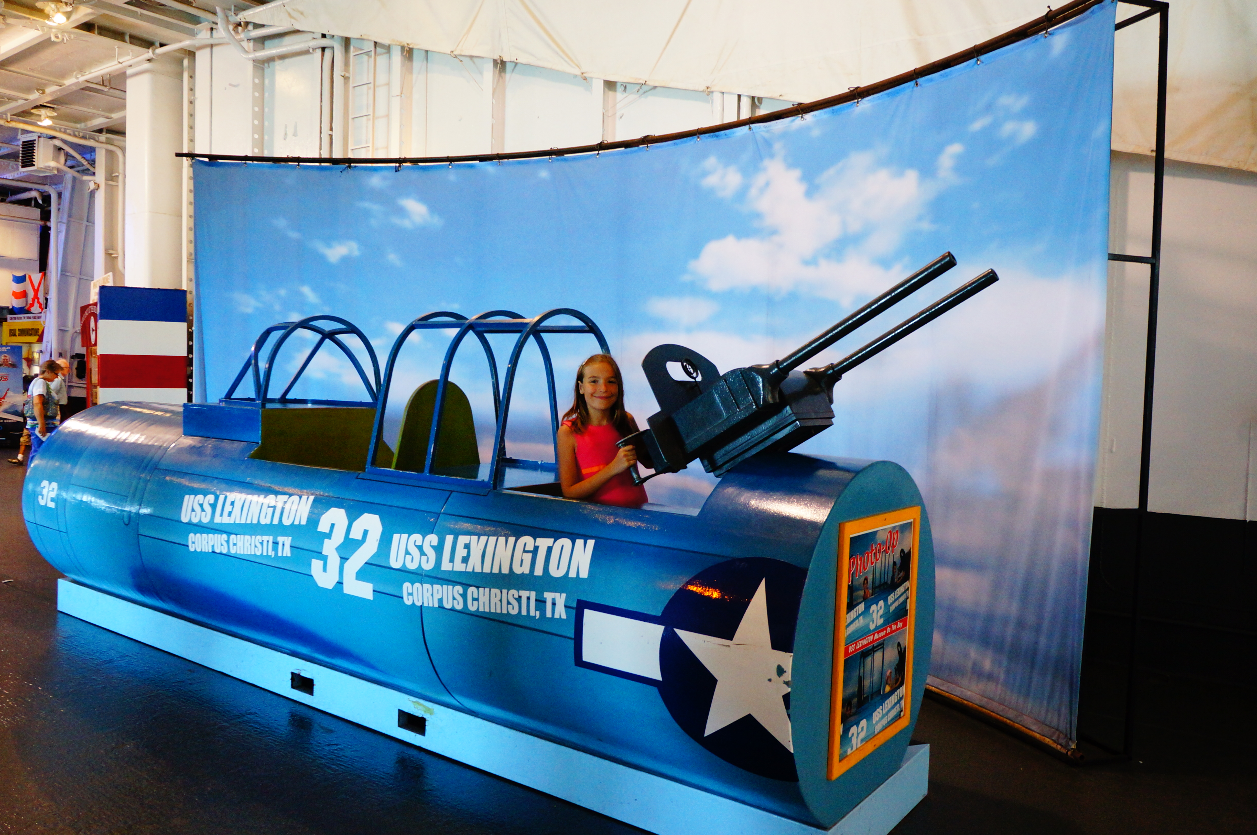 There are several tours to take, hard to decide which one to see 1st, but we all agree that we want to head straight up to the flight deck. Once you go up the flight of narrow stairs and come out into the open, no matter what side you look towards it’s amazing! You are standing on a 910-foot long and 142-foot wide “airport”. As I look at Carolina’s wide open mouth checking out all the fighter jets I tell her something I read in the brochure in my hand: Did you know you could play 3 football games or 14 basketball games at the same time on USS LEXINGTON‘s flight deck?