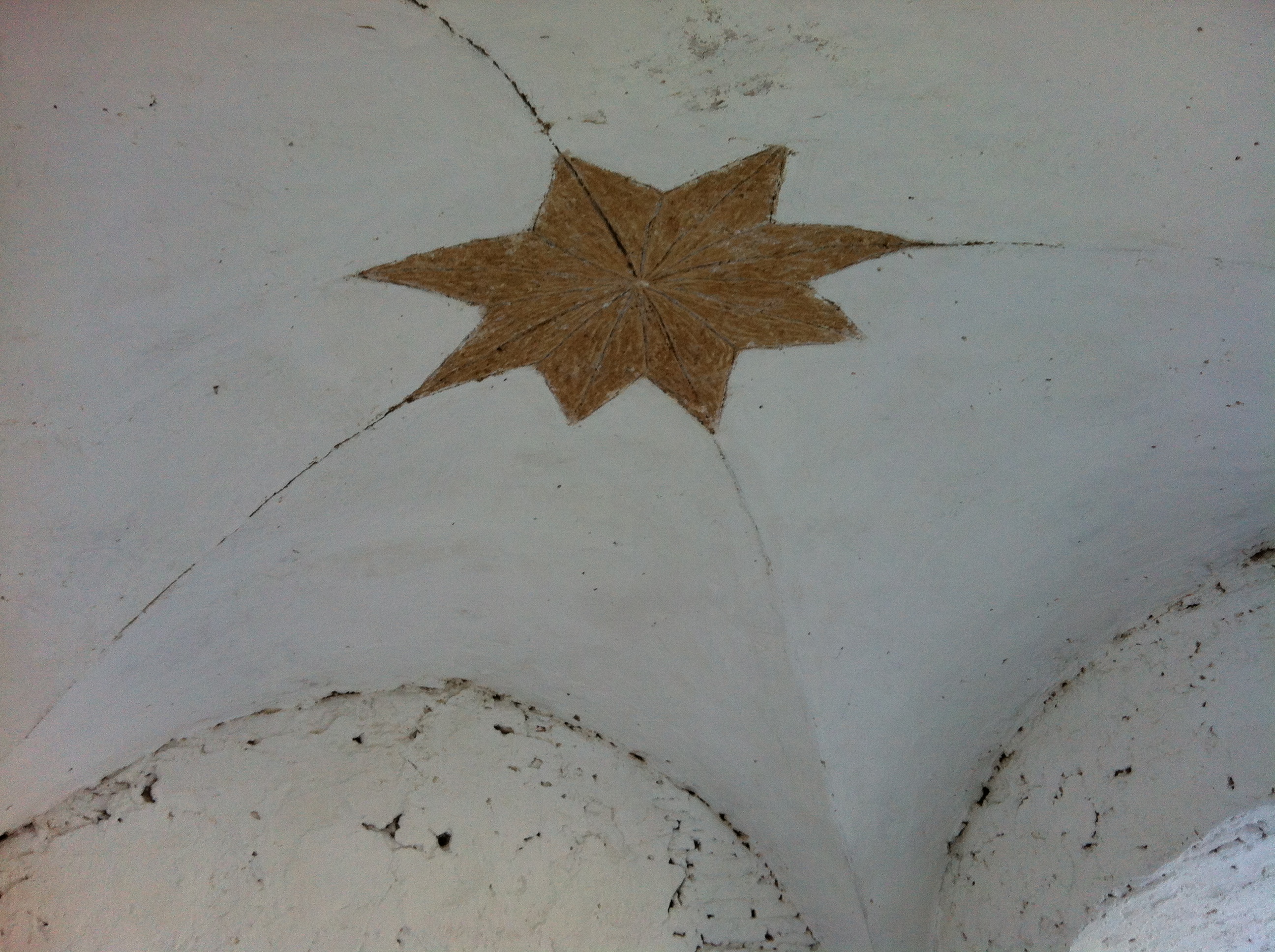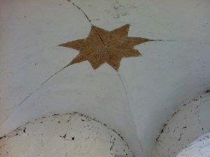 Inside the tower in the landing, you can see the pattern on the ceiling. Then you go up a very narrow set up steps to the roof top. Some pictures we took: